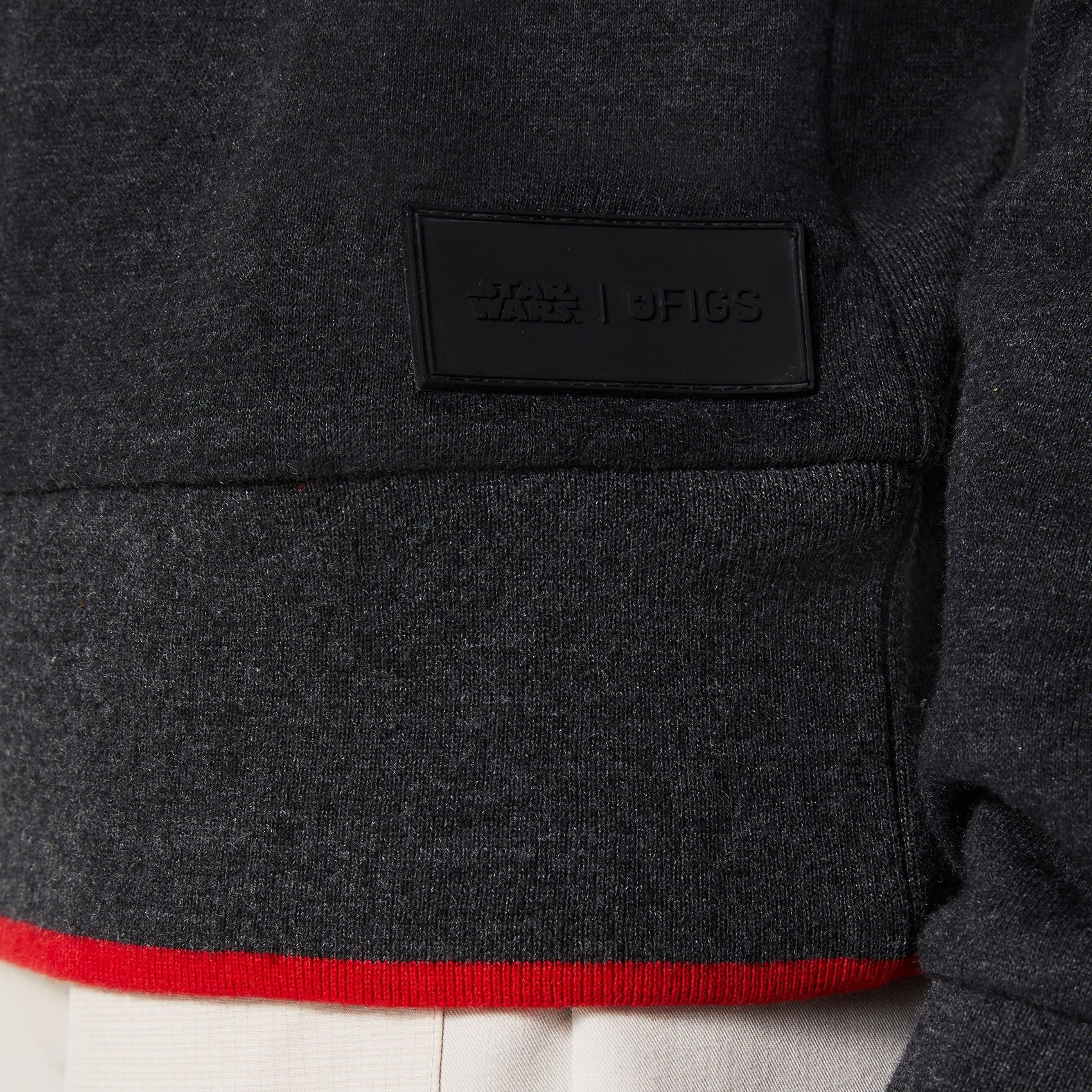 This incredibly soft, cozy sweatshirt has red ribbed details and a cool embossed Aurebesh graphic that says “I’m here to rescue you” on it.