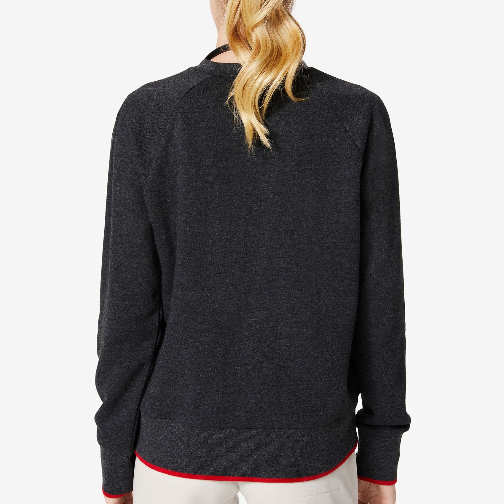 • Red striped ribbing at hem and cuffs